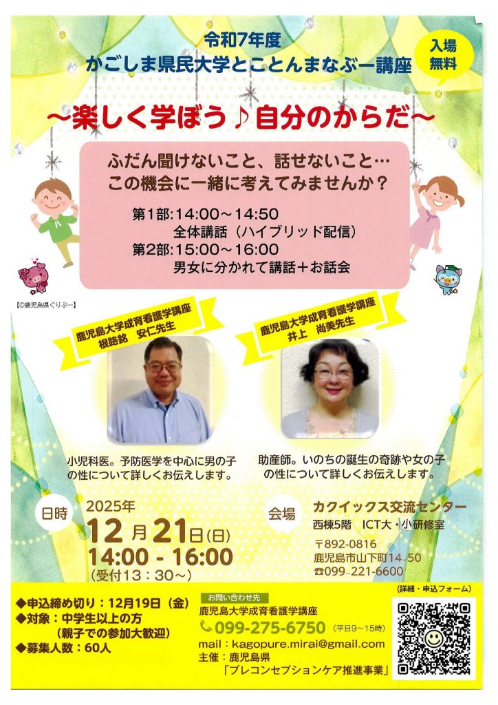 からだのことについて,ふだん聞けないこと,話せないことなど,この機会に一緒に考えてみませんか。受講を希望される方は,申込みフォームでお申し込みください。