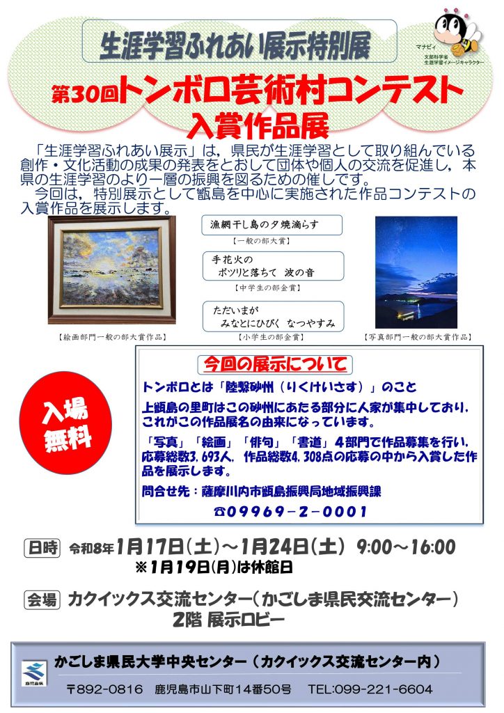 1月25日(土)から2月2日(日)まで,令和6年度第2回生涯学習ふれあい展示を実施しました。カクイックス交流センター(かごしま県民交流センター)6階ギャラリーを会場にして ,期間中多くの県民の方々に御来場いただきました。