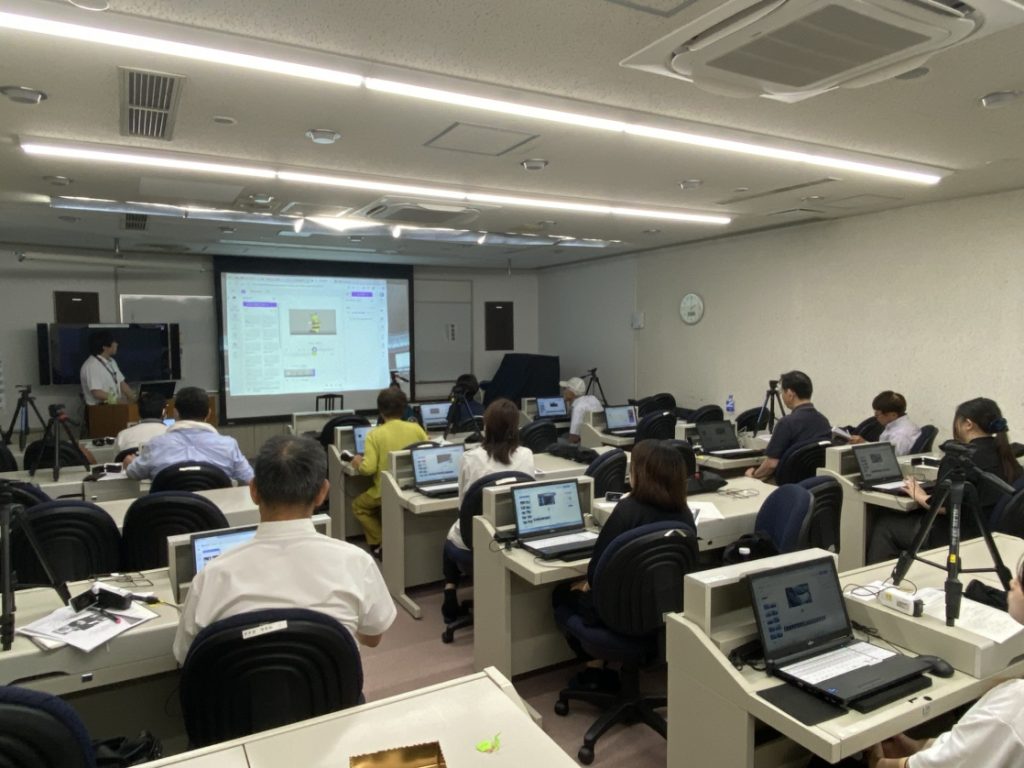 始めに県視聴覚ライブラリーの概要や利用の仕方について説明しました。講義2では,「GIGAスクール構想により1人1台端末が配備され,それをどのように利用するのか」を,児童生徒に自分ごととして考えさせる指導について,実際に演習を通して学んでいただきました。午後からは,まずZoomを使ったweb会議システムの体験をしました。その後,ビデオカメラを使って会場周辺を撮影し,編集する演習及び発表を行いました。