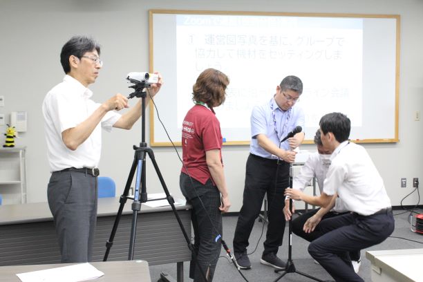前半は,ハイブリッド型のオンライン講座の企画・運営の仕方について,必要な機材や留意点について確認しました。その後,二つのグループに分かれて,主催者役,司会役,講師役,カメラ役,オンライン参加者役をそれぞれ担当して,模擬オンライン研修会を実施しました。主催者役として会議の開催や音響,カメラの調整,講師役としてスライドの共有,カメラ役としてカメラの操作等の仕方を身に付けていきました。